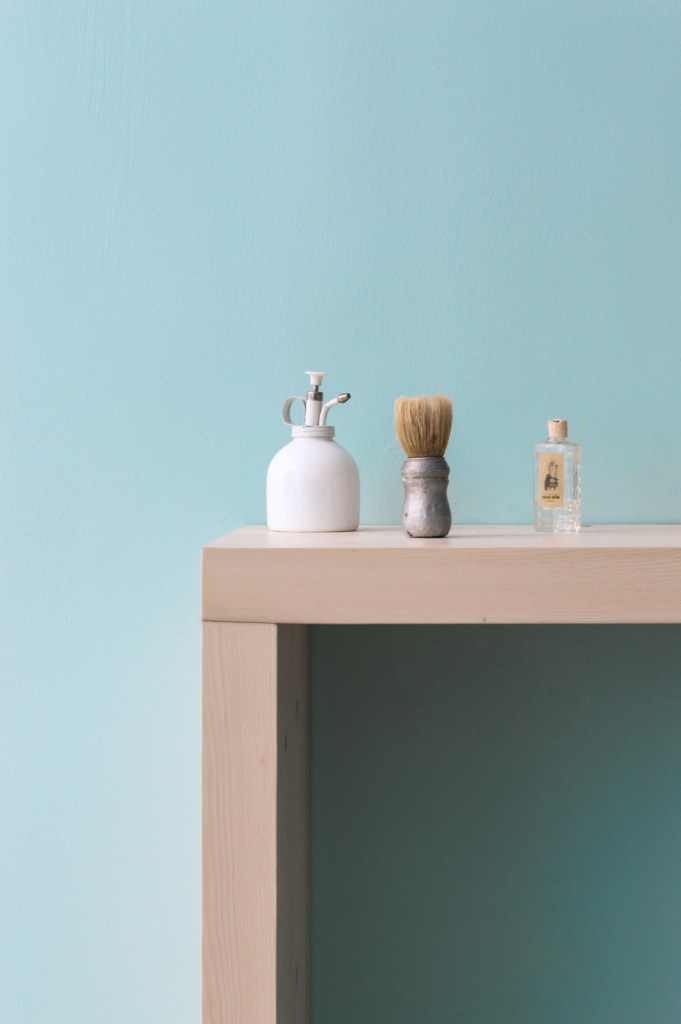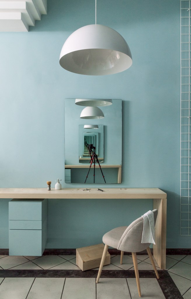 Un repertorio di finiture in cui il colore blu-polvere acido delle pareti da un tocco attraente, fresco e contemporaneo; il bianco illumina; il legno massello d’abete dà morbidezza e calore; e il verde vegetale crea un’atmosfera rilassante e naturale.