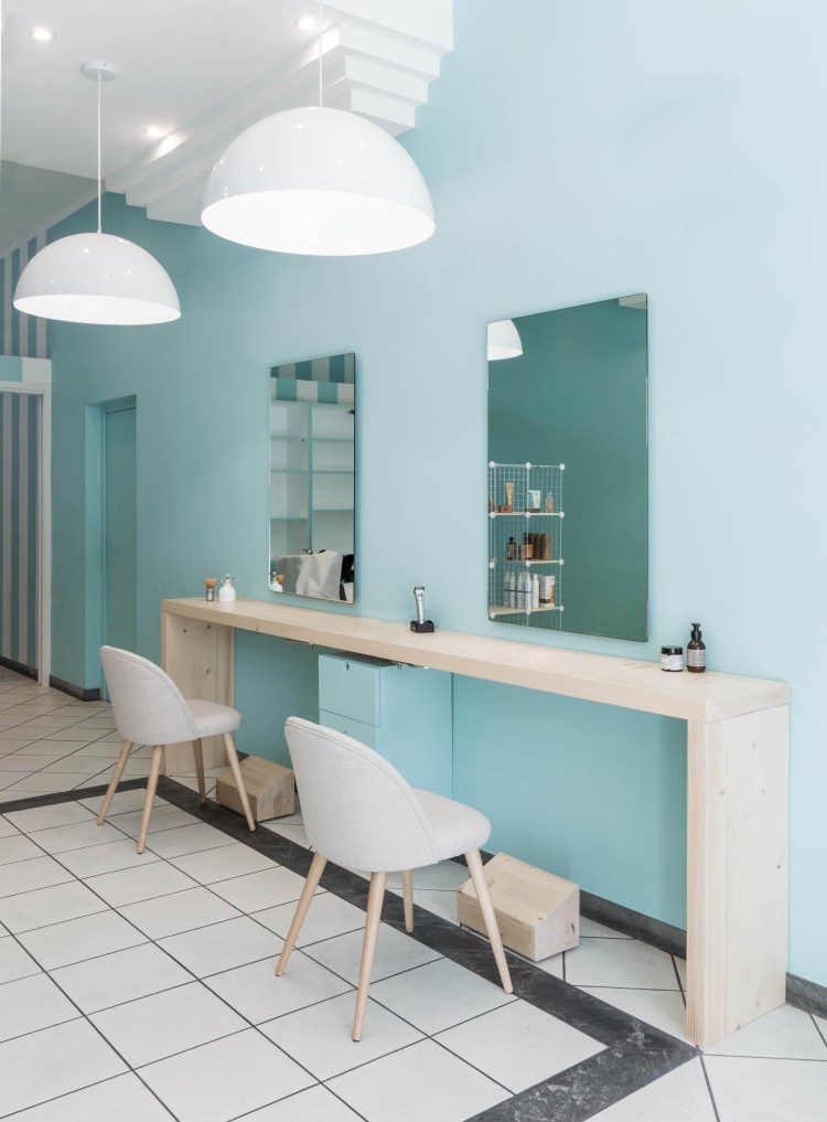 La zona adibita al taglio e alla pettinatura è risolta con un lungo banco d’abete che dà unitarietà allo spazio ed ottimizza gli spazi di lavoro. Su ogni postazione una lampada a sospensione scende sulla seduta avvolgendo il cliente in un’atmosfera intima e distaccata dall’intorno.
