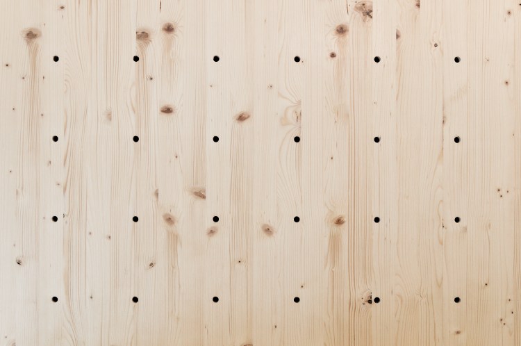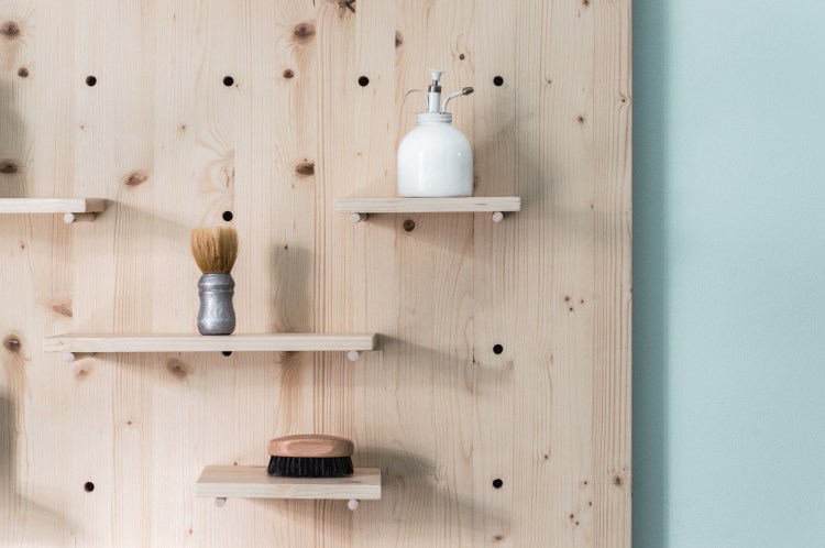 Presso il banco dell’accoglienza, che riprende i colori delle pareti, un pannello in abete fa da supporto ai prodotti, esposti su mensole di legno regolabili su una maglia modulare.