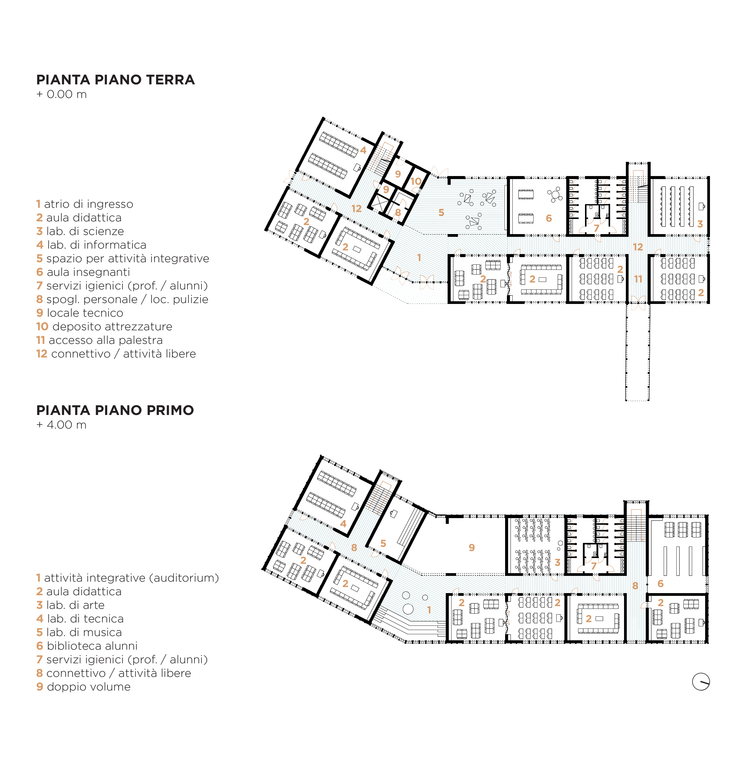 La nuova scuola si fa innanzitutto matrice di contesto urbano: la sua volumetria reagisce agli edifici preesistenti ( palestra ed ex-istituto professionale ) assecondando e raccordando le loro giaciture. La scelta di inserire il progetto nel lato nord dell’area disponibile deriva dal desiderio di connetterlo nel modo più diretto possibile alla palestra esistente facilitandone e incentivandone l’utilizzo. L’area su cui insisteva la vecchia scuola offre l’occasione di creare uno spazio esterno di grande comodità per le funzioni di accoglienza e sosta del trasporto pubblico essendo allo stesso tempo in rapporto diretto con Via Al Lago ma arretrato rispetto ad essa.