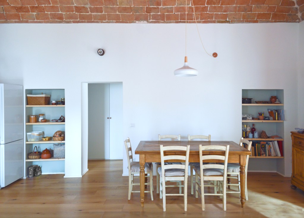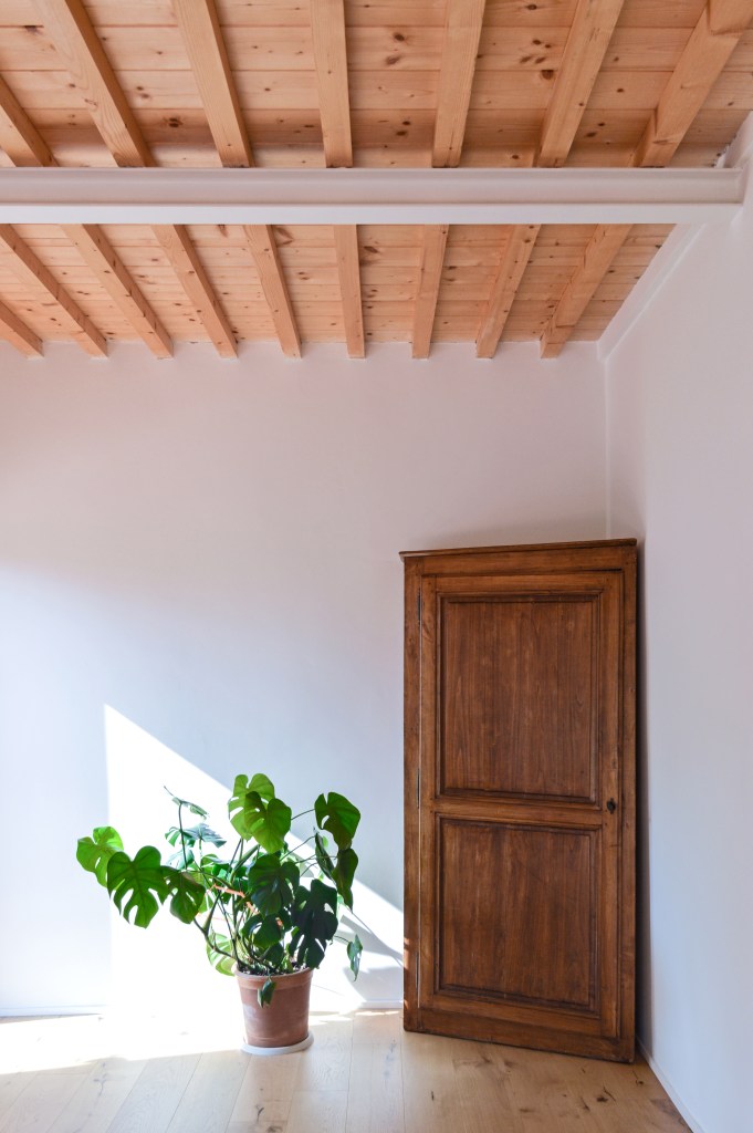 Materiali come il cotto della copertura, già presenti, sono stati riportati a vista e trattati con cura, mentre il parquet introduce una nuova stratificazione materica, calda e continua.